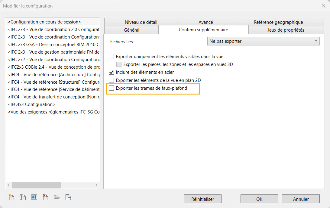 Une nouvelle case à cocher "Exporter les trames de faux-plafonds" est disponible dans le Contenu supplémentaire de la configuration des exports IFC.