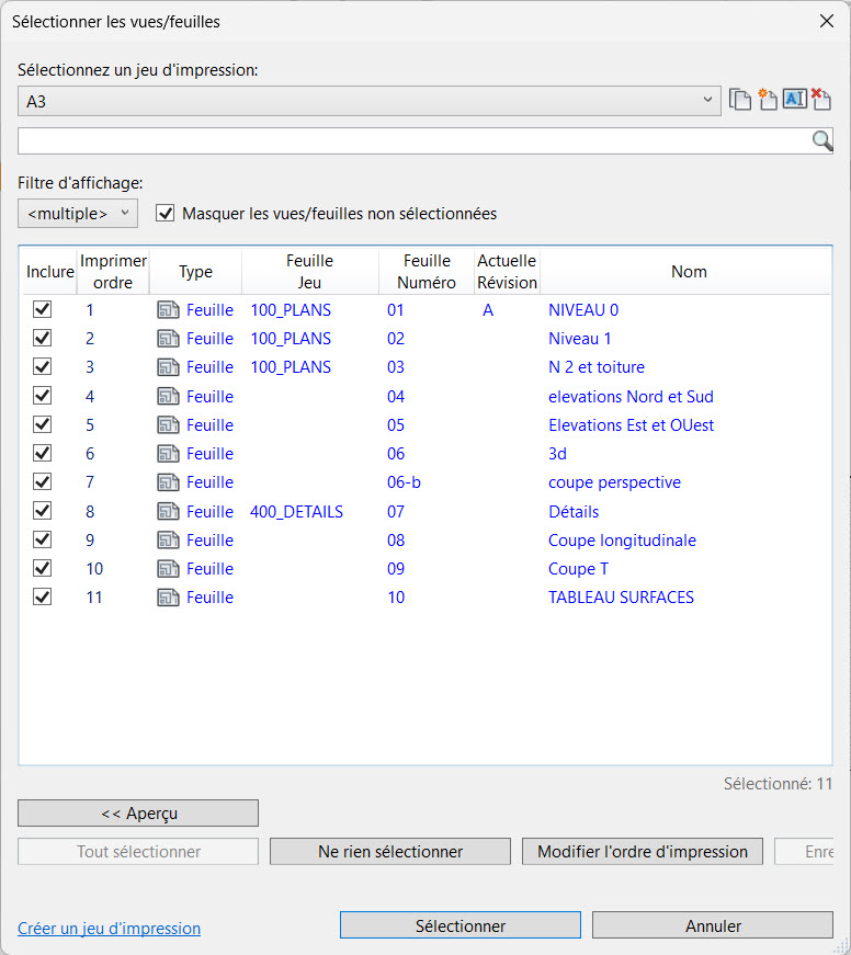 Trois nouvelles colonnes ont fait leur apparition dans la boîte de dialogue des sélection des Vues / feuilles à imprimer :