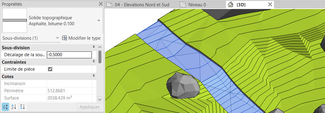 Le calcul des déblais et des remblais intègre également les modifications des altitudes des points du solide (sous réserve d'avoir au préalable créé une zone nivelée pour garder la trace du terrain naturel).