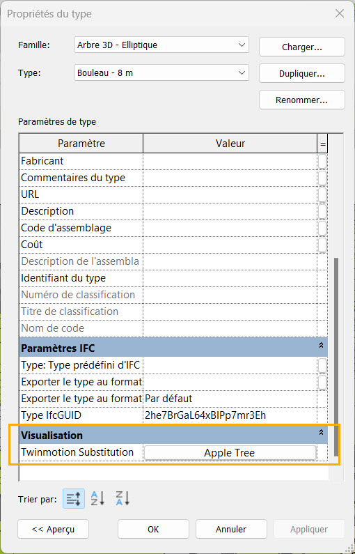 La possibilité de pré-régler l'association aux composants de Revit (Plantes / Mobilier...) des objets de la bibliothèque de Twinmotion.
